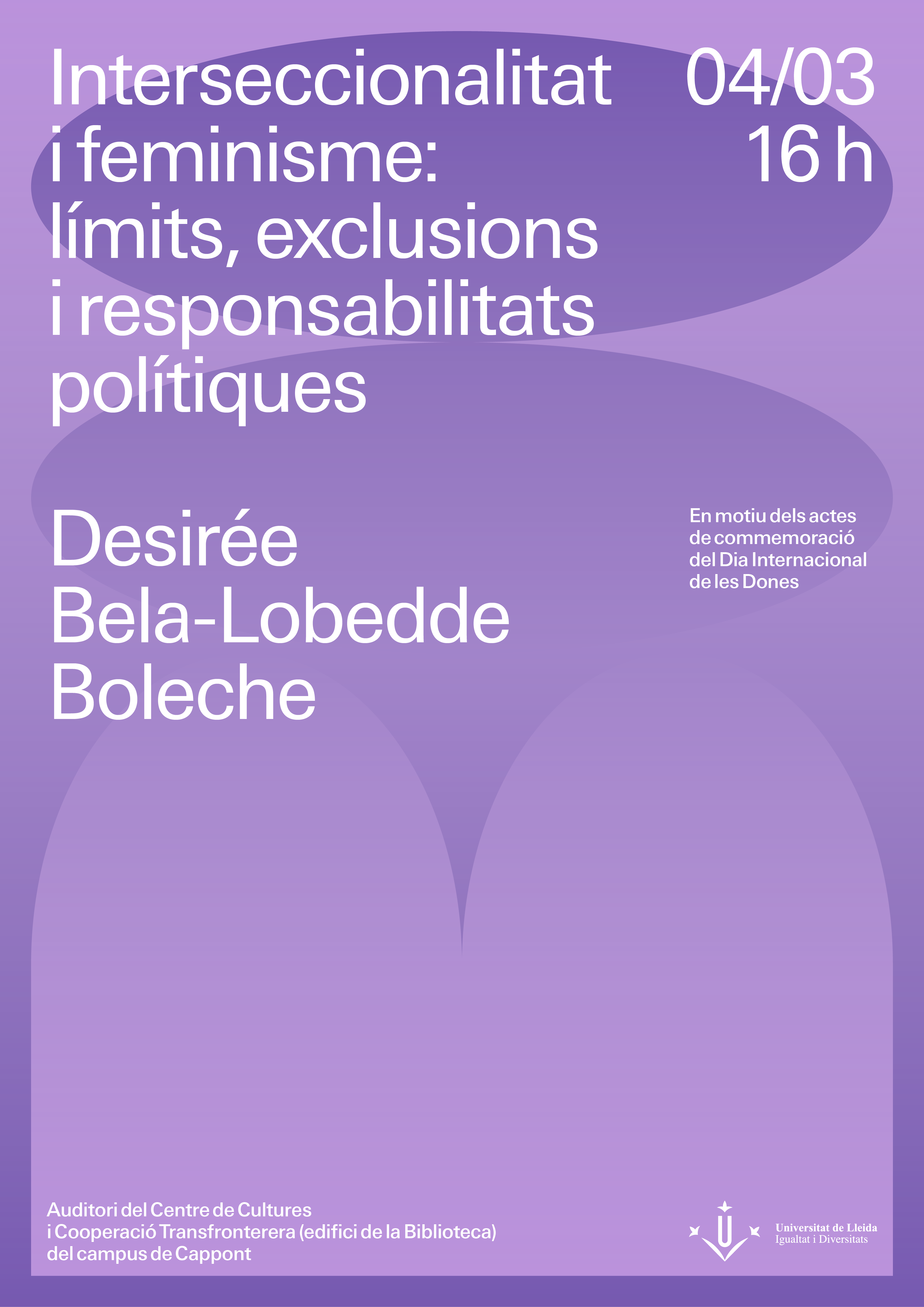 Descarregar PdfL'acte central de commemoració del 8 de març, Dia Internacional de les Dones, a la Universitat de Lleida consistirà en una conferència de l'activista feminista antiracista Desirée Bela-Lobedde que porta per títol Interseccionalitat i feminisme: límits, exclusions i responsabilitats polítiques. Tindrà lloc el dia 4 de març de 2026 a les 16:00 h a l'Auditori del Centre de Cultures i Cooperació Transfronterera (edifici de la Biblioteca) del campus de Cappont.